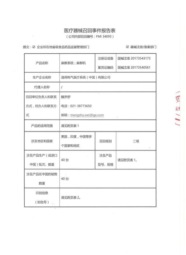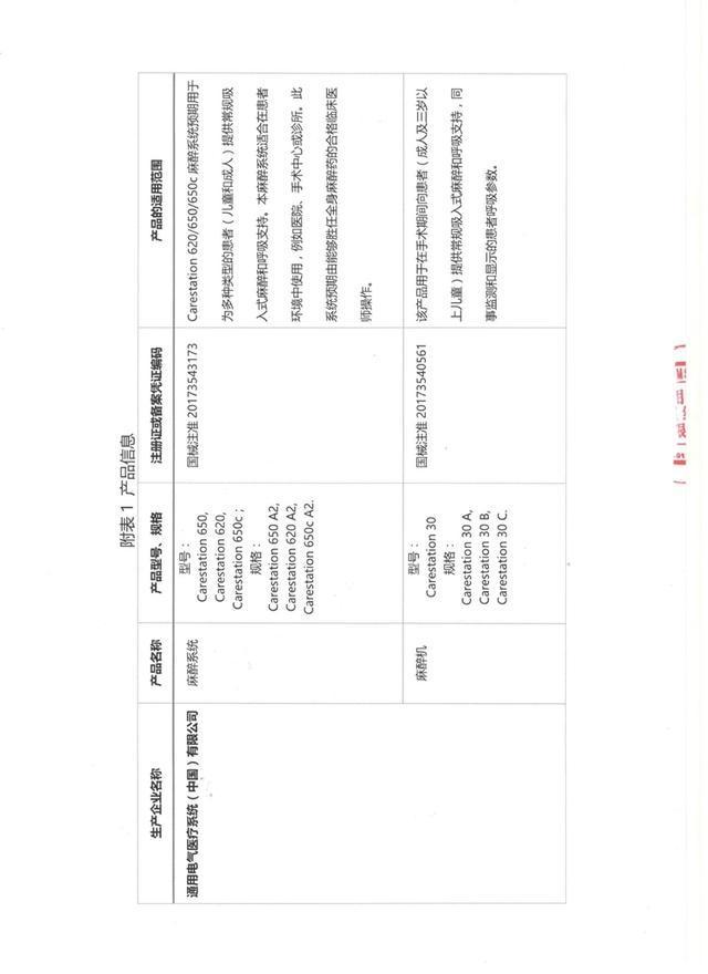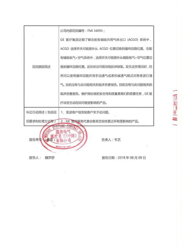 通用电气医疗系统(中国)有限公司对麻醉机主动召回